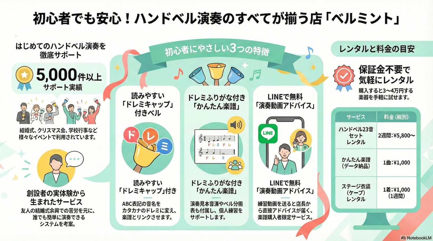 2006年にハンドベルのサポート専門店を開設し、ハンドベル楽器レンタル、初心者むけかんたん楽譜など、これまで5,000件以上のお客様にご利用いただき、多数のリンガーをサポートさせていただきました。