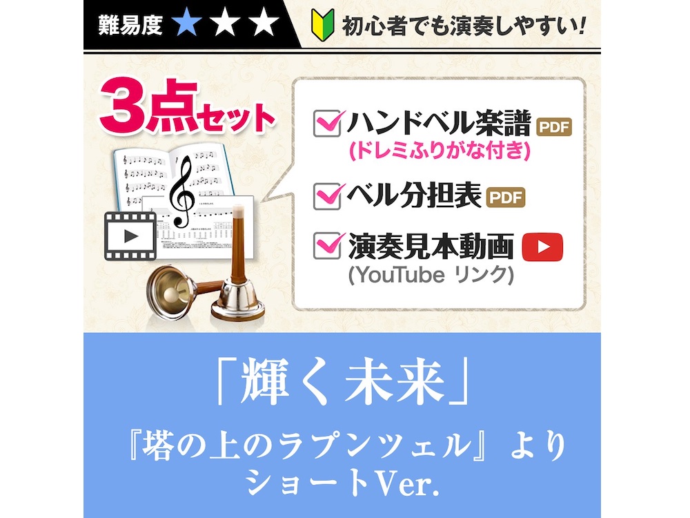 演奏人数とベル分担表(誰がどの音を担当するかの早見表)をお付けしています。早見表には各楽譜の「推奨人数」に合わせ4名(または5名)~9名までの各パターンを記載していますので、演奏人数の予定が変わっても安心です♪ ベルの分担に悩まないことが合奏への一番の近道。分担表を見ながら、まずは楽譜上の自分の担当音に蛍光ペンで色付けましょう。また音ごとに違う色を付けるとより楽譜が見やすいです。例えばドは赤、ミは青、ソは緑など。
