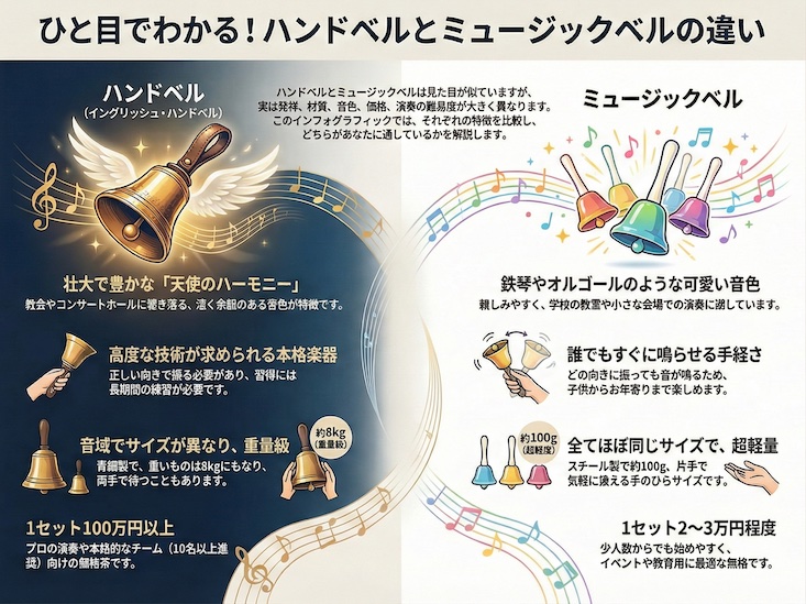 ハンドベルとミュージックベルって何が違うの? を画像や動画、10つの項目にて比較・解説いたします♪ まずは見た目の違いから・・・↓